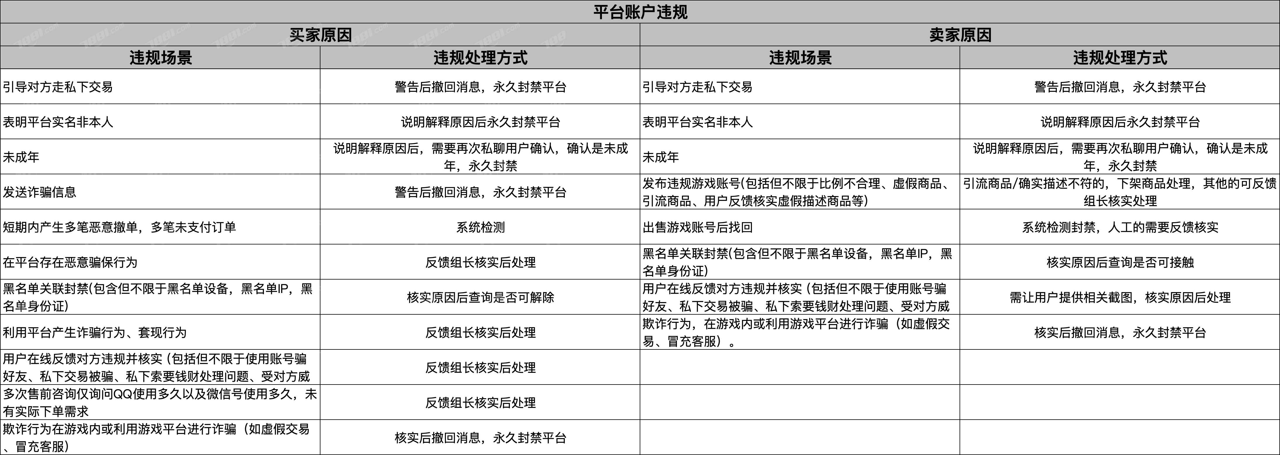 双方违规处理:买卖双方脱离平台进行私下交易,一经发现,双双永久封禁,且平台不提供任何保障。